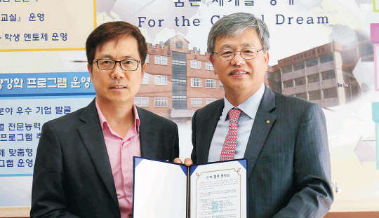 지난 13일 경기도 안산 경기모바일과학고등학교에서 조도순 교장(왼쪽)과 KB저축은행 김영만 대표가 산학협력을 체결하고 있다. 이 협약에 따라 KB저축은행은 모바일 금융 전문 인력 등을 활용해 교육프로그램을 진행하는 등 인재를 양성하는데 협력하기로 했다.