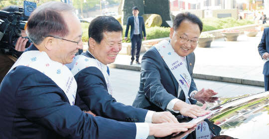 국토교통부는 14일 서울 프레스센터에서 '교통사고 없는 대한민국 만들기 다짐대회'를 개최했다. 유일호 국토부장관(오른쪽 첫번째)과 오영태 교통안전공단 이사장(두번째) 등이 교통안전 캠페인 스티커를 부착하고 있다.