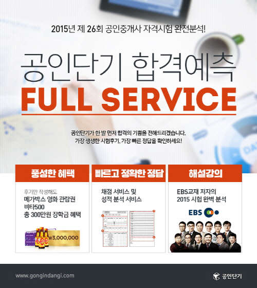 공인단기 합격예측 풀 서비스는 제 26회 공인중개사시험 채점 서비스 및 성적 분석 서비스를 제공하는 공인단기만의 특별 서비스다. 업계에서 가장 빠른 정답을 공개하고, EBS 교재 저자가 직접진행하는 시험 분석 해설강의도 제공된다.