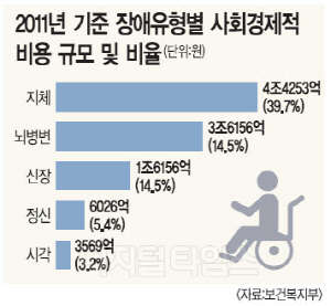 보고서에 따르면 장애로 인한 사회경제적 비용은 2011년 기준으로 11조1400억원이며, 이는 2008년 8조1100억원에 비해 37% 증가한 규모다. 1인당 연평균 사회경제적 비용은 2008년 650만원, 2009년 666만원, 2010년 668만원, 2011년 695만원 등으로 나타났다.