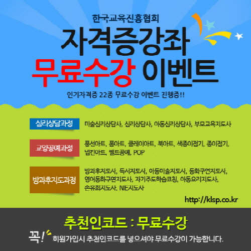 한국교육진흥협회 자격증사이트에 (http://klsp.co.kr) 회원가입 시 추천인코드 기재란에 '무료수강'만 적으면 민간자격증 무료 수강이 가능하다.