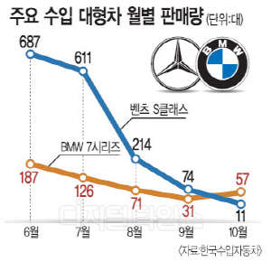 벤츠 S-클래스 중에서 올 들어 가장 많이 팔린 주력모델인 S350 블루텍(사륜 포함)의 경우 지난 6월 596대로 최고점을 찍은 이후 7월 497대, 8월 149대, 9월 38대, 10월 5대로 급격히 판매량이 감소했다. BMW 7시리즈 중 최다판매 모델인 740d x드라이브 역시 6월 97대로 최고점을 찍은 이후 7월 83대, 8월 56대, 9월 17, 10월 7대로 판매량이 지속해서 줄고 있다.