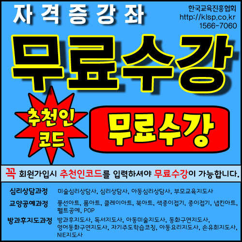 수강료를 전액 지원받을 수 있는 무료수강 이벤트 참여방법은 한국교육진흥협회 자격증 사이트에 (http://klsp.co.kr) 회원가입 시 추천인코드 입력란에 '무료수강'을 적으면 무료로 학습이 가능하며, 이벤트에 관련된 문의는 (1566-7060) 으로 하면 된다.
