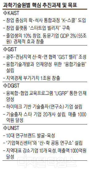 각 과기원은 위치한 지역의 대표기업을 육성에도 나설 계획이다. GIST는 광주·전남지역 교육·연구기관과 기업체간 협력의 중심으로 'GIST 밸리'를 조성한다. UNIST는 울산은 물론 부산, 경남권 지역산업 수요에 적합한 '바이오메디컬'과 'ICT 융합' 등 10대 연구 브랜드를 개발, 대표기업 10개를 육성한다.