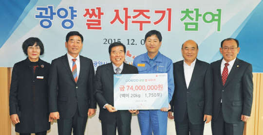 포스코 광양제철소 김순기 행정부소장이 (재)사랑나눔 복지재단 문승표 이사장에게 광양 쌀 1760포대를 전달하고 정현복 광양시장 등과 기념촬영을 했다.