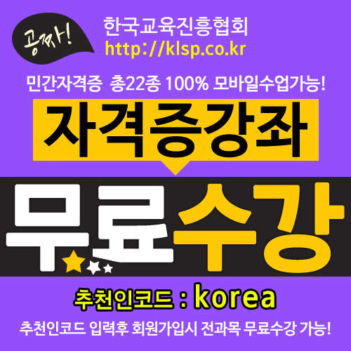 한국교육진흥협회 자격증사이트에 (http://klsp.co.kr) 회원가입 을 하면서 추천인코드란에 'korea'만 적으면 민간자격증 무료 수강이 가능하다.