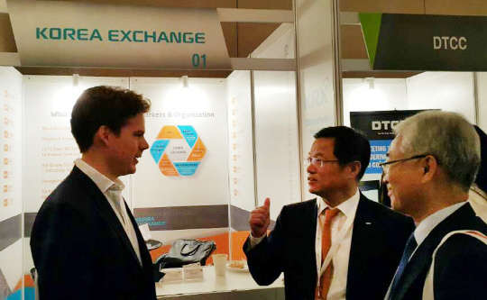 한국거래소는 8일부터 10일까지 사흘간 싱가포르에서 개최되는 'FIA 아시아 파생상품 콘퍼런스'에 참가해 KRX 파생상품 마케팅·세일즈 활동을 했다고 9일 밝혔다. 거래소는 자체 홍보부스를 설치해 최근 KRX파생상품 시장에 신규 상장한 미니코스피200 선물옵션, 위안선물 및 배당지수선물, 코스닥150선물 등에 대한 마케팅을 했다. 이용국 거래소 파생상품연구센터장(왼쪽에서 두번째)이 해외투자자들을 대상으로 설명하고 있는 모습.