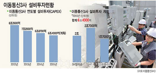 이통 3사는 지난 2011년부터 시작한 LTE 전국망 투자를 마친 이후 지난 2013년부터는 투자 규모를 줄여가고 있다. 3사는 지난 2012년에 8조2500억원을 집행한 이후, 2013년 7조2000억원, 2014년 6조8700억원, 올해 6조4000억원 등 투자를 줄여왔다.