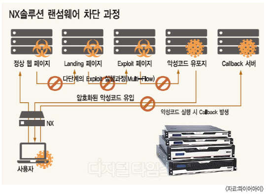 랜섬웨어의 침입은 익스플로잇 실행, 유입, CnC 서버 접속 단계 등 크게 세 단계로 나뉜다. 첫째 익스플로잇 실행 단계에서는 정상 페이지에서 악성코드 유포지로 여러 단계를 거쳐 리다이렉션 된 후 익스플로잇이 실행된다. 따라서 전체적인 웹 플로우를 분석할 수 있어야만 해당 유포지를 파악하고, 차단할 수 있다. 파이어아이는 자사 네트워크 보안 제품인 NX시리즈를 통해 이러한 웹 익스플로잇이 실행되는 전체 과정에 대한 정보를 제공할 수 있다고 강조한다.