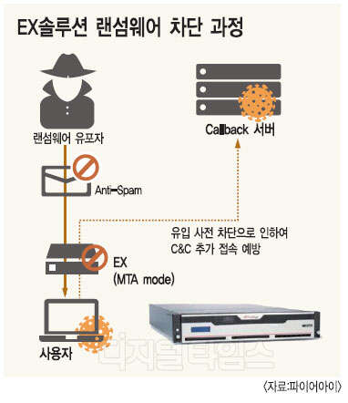 ◇첨부파일·악성링크 형태 랜섬웨어 유포 차단= 파이어아이는 웹을 통한 감염뿐 아니라 피싱 이메일을 통한 랜섬웨어 공격을 막기 위한 전략도 제시했다. 일반적으로 이메일을 통한 램섬웨어는 첨부 파일이나 악성 링크를 통해 유포된다. 파이어아이의 이메일 보안제품인 'EX시리즈'는 의심스러운 이메일 첨부 파일과 내장된 URL을 실행 및 분석하고, 모든 악성 이메일을 차단할 수 있다는 게 회사 측 설명이다. EX는 보안 활성화 모드인 MTA(Mail Transfer Agent) 모드를 통해 랜섬웨어가 사용자 PC에 유입되기 전 사전 차단한다.