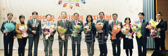 행정자치부가 17일 서울 중구 대한상공회의소에서 대한민국 선진화와 전자정부 세미나를 개최했다. 이날 세미나에서 진행된 전자정부발전유공 시상식에서 정재근 행정자치부 차관(왼쪽 여섯번째)과 수상자들이 기념촬영을 하고 있다. 사진 왼쪽부터 국무총리표창을 수상한 이규일 춘천시 지방전산주사, 장윤영 제주도 지방전산주사, 서동일 기상청 기상연구관, 황재윤 사회보장정보원 부장, 근정포정을 수상한 김동석 행정자치부 부이사관, 정재근 차관, 녹조근정훈장을 수상한 김미량 성균관대 교수, 국무총리표창을 수상한 김범환 한국지역정보개발원 책임연구원, 이재근 한국정보화진흥원 수석연구원, 대통령 표창을 수상한 윤선희 경상남도 지방행정사무관, 조창희 법제처 기술서기관, 박영찬 지케스 대표이사.