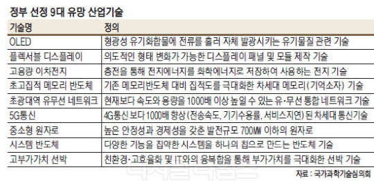 형광성 유기화합물에 전류를 흘려 자체 발광시키는 기술인 OLED(유기발광다이오드), 자유롭게 구부리거나 말아 쓸 수 있는 플렉서블 디스플레이, 고용량 2차전지, 집적도를 극대화한 차세대 기술인 초고집적 메모리 반도체, 현재보다 속도와 용량을 1000배 이상 높일 수 있는 초광대역 유·무선 네트워크 등이 9대 기술로 선정됐다.