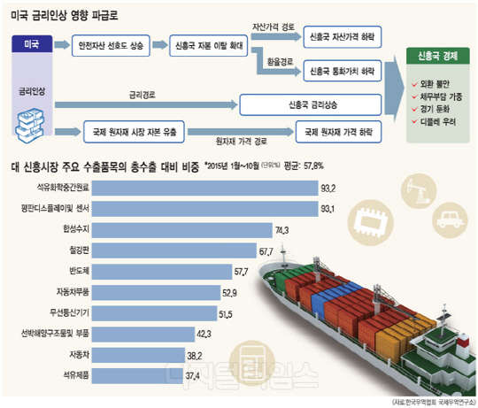 한국무역협회는 이날 보고서에서 미국의 금리 인상이 국제유가 내림세를 가속해 산유국을 중심으로 한 신흥국의 수출 감소를 예상했고, KOTRA 역시 브라질, 러시아, 콜롬비아, 남아프리카공화국 등 원자재 수출 비중이 높은 국가들에 대한 수출이 더 큰 타격을 받을 것으로 전망했다. 중국의 경기 둔화와 국제유가 하락 등이 복합적으로 작용하면, 자본의 흐름이 신흥국에서 이탈해 안정적인 미국 등 선진국으로 다시 회귀하면서 신흥국의 경기가 급격히 악화할 것이라는 이유에서다.