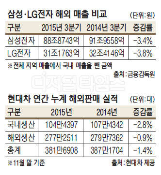 이 같은 상황은 국내 주요 대기업의 수출 실적에도 그대로 나타났다. 전자업계를 대표하는 삼성전자와 LG전자의 경우 3분기 말까지 누적으로 국외 매출이 3~4%가량 줄었고, 특히 중남미 등 신흥 시장에서의 매출 내림세가 두드러졌다.