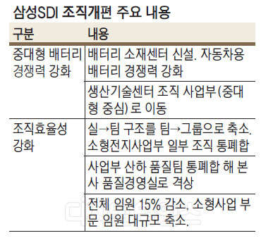 삼성SDI는 또 효율성과 수익성 강화를 위한 조직 슬림화 작업도 했다. 우선 기존 실→팀 단위의 조직을 팀→그룹으로 축소했고, 소형전지사업부의 경우 일부 조직을 통폐합해 임원 숫자를 기존보다 약 40% 줄인 것으로 알려졌다. 중대형사업부의 경우 기존 틀을 유지했다.