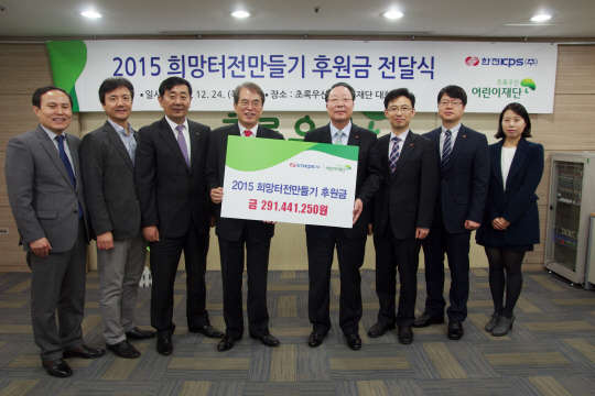 최외근 한전KPS 사장(왼쪽 다섯번째)이 지난 24일 서울시 무교동 초록우산 어린이재단에서 이제훈 회장(네번째)에게 '2015년 희망터전만들기 후원금' 2억9000여만원을 전달했다.