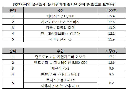 최현석 SK엔카직영 직영사업부문장은 "제네시스 EQ900이 국내는 물론 전 세계 고급차 시장에서 해외 브랜드와 치열한 경쟁을 펼칠 것을 예고해 소비자들의 관심을 한몸에 받고 있다"며 "수입에서는 프리미엄 브랜드에서 젊은 소비자층을 겨냥해 출시한 실용성을 강조한 모델들이 인기를 얻고 있다"고 말했다.