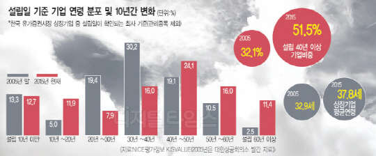◇ 국내 상장기업 평균 연령 '37.8년'= 대한상공회의소에 따르면 2015년 유가증권시장에 상장된 국내 기업의 평균 연령은 37.8년을 기록했습니다. 상장기업 중 절반이 넘는 51.5%의 기업이 설립 후 40년 이상이 지났습니다. 반면 설립 20~40년 기업의 비중은 2005년 49.6%에서 2015년 23.9%로 뚝 떨어졌습니다. 전문가들은 물론, 단순히 기업 연령이 늘었다고 해서 반드시 문제가 되는 것은 아니라고 말합니다. 다만 제조업 등 지난 10년간 우리 경제를 주도하고 있는 주요 기업들이 점차 고령화되고 있는 것은 경제와 산업의 활력에 영향을 미칠 수 있다는 점에서 주목할 필요가 있다고 조언합니다.