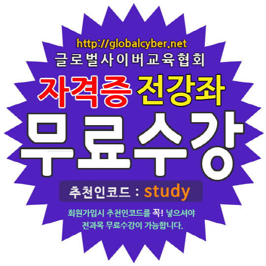 한편 글로벌사이버교육협회 취업자격증 무료수강 교육과정 참여 방법은 홈페이지에서 보다 자세한 교육상담 및 학습지원이 가능하며 글로벌사이버교육협회의 홈페이지에 회원 가입 시 추천인(쿠폰코드)에 'study'를 입력하면 총 22개의 민간자격증과정에 대한 무료수강이 가능하다.