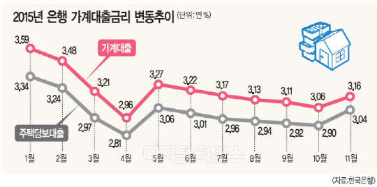 4일 은행권에 따르면 10년 분할상환기준 주택담보대출금리(이하 주담대)가 은행별로 0.2%포인트 이상 오른 것으로 나타났다. 앞서 한국은행이 지난해 12월 30일 발표한 '2015년 11월 중 금융기관 가중평균금리' 통계에 따르면 11월 시중은행의 가계대출 금리(신규취급액 기준)는 연3.16%로 10월(연3.06%)보다 0.1%포인트 올랐다. 전체 가계대출의 상당수를 차지하는 주택담보대출(이하 주담대)은 연3.04%로 전달보다 0.14%포인트 오르며 6개월 만에 연3%대에 재진입했다.