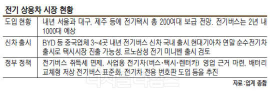 운송업계 한 관계자는 "현재 나온 순수 전기차의 주행시간과 배터리 관리 특성상 일반 소비자보다는 버스나 택시 등 사업자에 더 적합한 측면이 있다"면서 "정부의 보조금 및 정책 지원이 이뤄질 경우 전기차로 선회하는 업체가 더욱 늘어날 것으로 보인다"고 말했다.