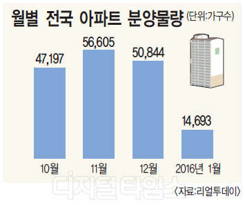 4일 부동산리서치 전문업체 리얼투데이에 따르면 이달 아파트 일반분양 공급물량은 전국 26개 단지 1만4693가구로 작년 12월(5만844가구)보다 71%(3만6151가구) 감소했다.
