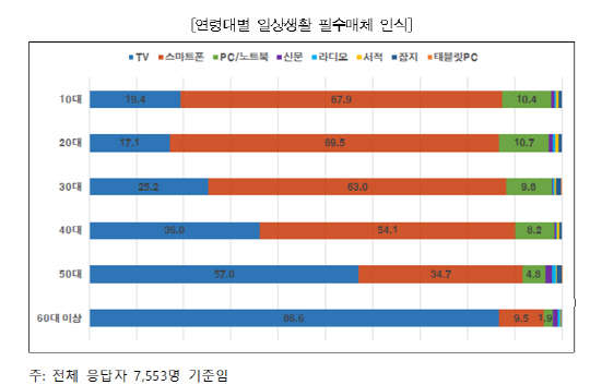 연령별로 보면 10대(67.9%), 20대(69.5%), 30대(63.0%), 40대(54.1%) 등은 스마트폰을 가장 필수적인 매체로 선택했다. 50대와 60대 이상은 TV를 필수매체로 꼽은 비율이 각각 57.0%, 86.6%로 스마트폰보다 많았다. 스마트폰을 필수매체로 선택한 40대 이상 비중은 최근 3년 동안 큰 폭으로 증가하면서 스마트폰 중요성이 고연령층으로 확산하는 경향을 보였다고 방통위는 분석했다.