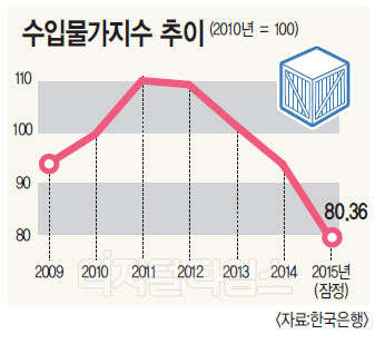 한국은행(이하 한은)이 13일 발표한 '2015년 12월 수출입물가지수'를 보면 지난해 수입물가지수는 80.36으로 2014년(94.92)보다 15.3% 하락했다. 한은이 통계작성을 시작한 1971년부터 연간 기준으로 가장 큰 낙폭이다.