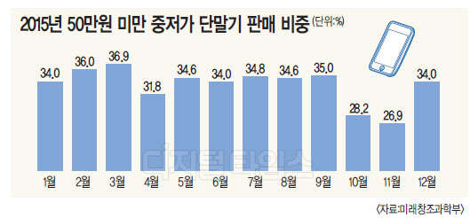 14일 미래창조과학부에 따르면 지난달 50만원 미만의 중저가 단말기 판매 비중은 34.0%를 기록한 것으로 나타났다. 이에 따라 지난해 전체의 중저가 단말기 비중은 평균 33.4%를 기록했다. 단통법 시행 전 2014년 7~9월 평균 21.5%보다 무려 11.9%포인트 늘어난 수치다.