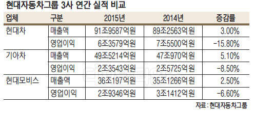 현대자동차와 기아자동차, 현대모비스 등 이른바 '현대차그룹 3인방'이 지난해 악화한 영업이익 성적표를 잇달아 제출했다. 신흥국의 판매둔화와 통화가치 하락, 판촉비의 증가 등으로 3사 모두 수익성이 낮아질 것이라는 시장 우려가 현실로 드러냈다.