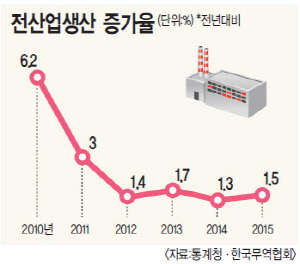 최근 전산업생산의 증가 추이를 보면 이전보다 전반적으로 낮은 수준에 머물고 있다. 전산업생산은 2010년 6.2% 증가를 기점으로 꺾였는데, 2011년 3%로 반 토막이 나더니 2012년 1.4%, 2013년 1.7% 2014년 1.3%, 지난해 1.5% 등 4년 연속 1%대 증가에 머물고 있다.