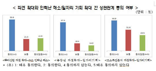 '고소득·전문직의 파견확대 역시 일자리 기회 확대로 이어질 것으로 생각하는가'라는 질문에 '동의한다'는 응답은 44.9%, '동의하지 않는다'는 응답은 23.5%였다.