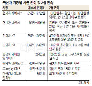 4일 업계에 따르면 현대·기아차의 경우 2월에 개소세 인하분을 제외한 특별 추가 할인 혜택을 합치면 지난 12월보다 혜택이 늘어난 차종이 4개에 달한다.