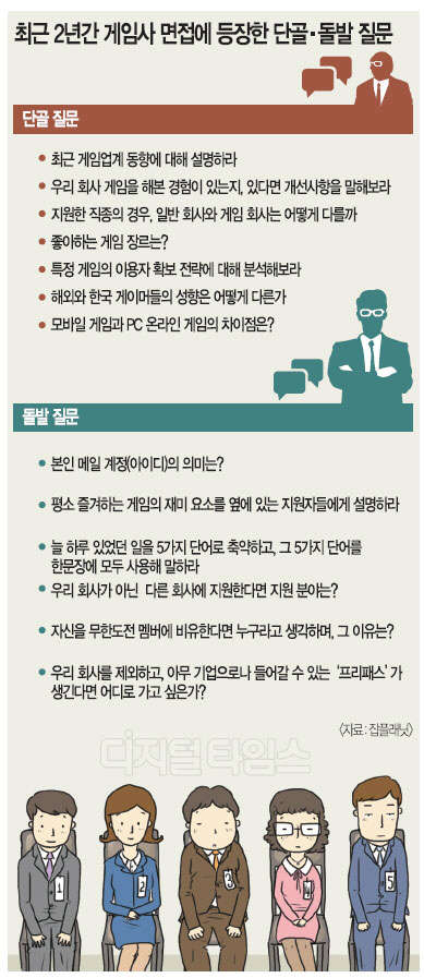 취업포털 잡플래닛 분석에 따르면 최근 2년간 게임사 면접에는 '최근 게임업계 동향에 대해 설명하라', '우리 회사 게임을 해본 경험이 있는지, 있다면 개선사항을 말해보라'는 질문이 단골 질문으로 등장했다. 또 '같은 직종이라도 일반 회사에서 일하는 것과 게임 회사에서 일하는 것은 다르다. 어떻게 다를까'를 묻는 면접관도 많았다는 분석이다. 이와 함께 모바일게임이 PC 온라인게임과 다른 점, 좋아하는 게임 장르, 특정 직무에 지원한 이유, 해외·한국 이용자 성향 비교 등에 대한 답변은 기본적으로 준비해야 한다는 조언이다. 이 밖에 특정 게임의 이용자 확보 전략을 분석해보라는 질문도 단골로 등장했다.