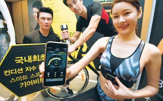 속옷전문기업 좋은사람들이 22일 서울 소공동 웨스틴조선호텔에서 입기만 해도 심박수, 체온 등을 분석하고 신체 컨디션을 한 눈에 보여주는 스마트 스포츠웨어 '기어비트S (Gearbit S)'를 선보이고 있다.