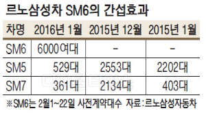 월 2000대 수준으로 팔리는 SM5는 1월 전년 동월(2202대)보다 76.0% 감소한 529대를 기록했다. 이는 전월(2553)과 비교해서도 79.3% 떨어진 수치다. SM7 역시 전년 동월(403대)보다 10.4%, 전월(2134대)보다는 83.1% 판매량이 떨어지면서 361대를 판매하는 데 그쳤다. 현재 영업 일선에서 SM6에 대한 판촉을 집중하면서, SM5와 SM7의 계약 현황도 떨어진 것으로 전해졌다.