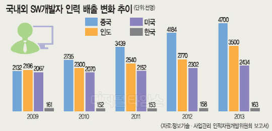 반면 중국과 인도, 미국과 일본은 꾸준한 상승세를 보이고 있다. 정보기술·사업관리 인적자원개발위원회(이하 ISC)가 올 1월 발간한 'SW 인력실태 4분기 보고서'에 따르면 신흥국인 중국의 경우 2009년 21만3200여명이던 신규 인력 배출 규모가 2011년 34만3900여명, 2013년 47만여명으로 급격히 증가했다. 인도도 2009년 21만9600여명에서 2011년 25만4000여명, 2013년 35만여명(추산)으로 크게 늘어났다.
