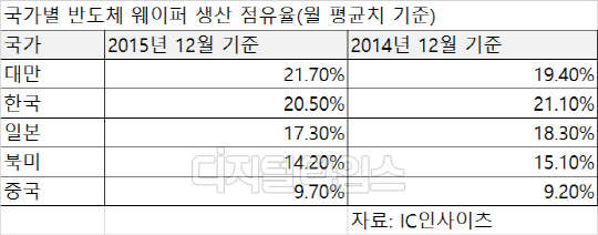 웨이퍼란 반도체 집적회로(IC)를 만드는 실리콘 기판을 말한다. 웨이퍼 생산량은 반도체 생산능력을 가늠하는 잣대로 쓰인다. 대만과 한국에 이어 일본(17.3%)이 3위를 차지했고 이어 북미(14.2%), 중국(9.7%), 유럽(6.4%) 등이 뒤이었다.