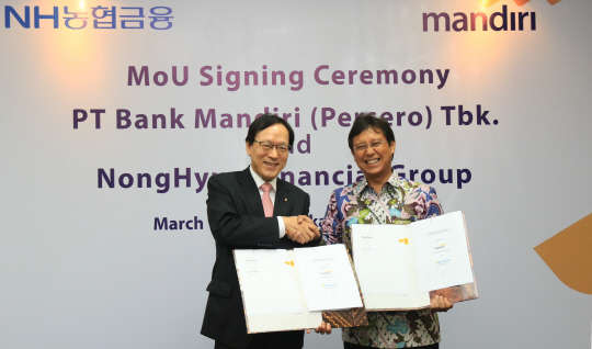 NH농협금융지주는 1일(현지시간) 인도네시아 만디리은행과 상호 협력 및 현지 농업금융 발전을 위한 합작사업 등에 관해 협약을 체결했다. 이번 협약에 따라 두 회사는 인도네시아 농촌개발을 위해 은행뿐 아니라 보험, 리스, 마이크로 파이낸스 등 금융 분야 전반에 걸쳐 보유한 금융 노하우와 사업 네트워크를 기반으로 공동 지분투자 등 전방위 협력을 추진한다. 김용환 NH농협금융 회장(왼쪽)과 부디 사디킨 만디리은행장이 협약 후 기념촬영을 하고 있는 모습.