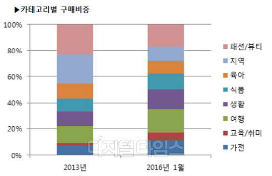 또 각 카테고리별 매출 비중도 고르게 확장되고 있는 것으로 조사됐다. 2013년도에는 지역 상품 22%, 패션·뷰티가 23% 비중으로 지역과 패션 상품 위주로 판매가 됐지만 2013년에 1%대의 낮은 비중이었던 교육·취미 카테고리가 올해에는 6%, 해외여행 비중도 7%까지 상승했다. 반면 올해 1월 지역상품은 11%, 패션·뷰티 상품은 17%로 비중이 줄어들면서 소셜커머스에서 소비되는 품목들이 다양화되는 추세다.