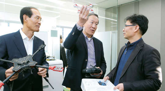 허 회장이 지난 2일 전남 여수시 덕충동에 있는 전남창조경제혁신센터에서 허 창수 GS 회장(가운데)이 입주기업인 '마린로보틱스' 서경필 대표(오른쪽)로부터 GPS(위성항법장치) 자율비행 기반 농약살포 방제용 드론 개발과 사업 내용에 대한 설명을 듣고 있다.