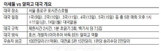 구글은 인간과 인공지능 소프트웨어의 바둑 첫 대국 전날인 8일 서울 포시즌스호텔에서 간담회를 열고 이세돌 9단과 알파고의 대국이 9일부터 오는 15일까지 5회에 걸쳐 펼쳐진다고 밝혔다. 알파고는 구글이 2014년 인수한 인공지능 기술업체 딥마인드의 컴퓨터(인공지능) 바둑 프로그램이다.