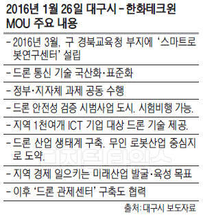 22일 업계에 따르면 지난 1월 대구시와 한화테크윈이 협약(MOU)해 이달 말까지 설립하기로 한 스마트로봇연구센터가 임시 거처에서 출범한다. 스마트로봇연구센터는 외산에 의존하는 드론 통신 기술을 국산화·표준화하고 국내 드론 산업 생태계를 육성하기 위해 설립한다.
