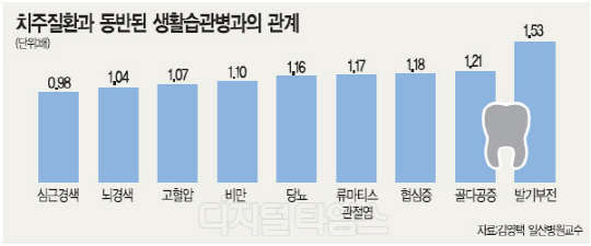 평소 잇몸병(치주병)을 앓으면 심혈관계 질환, 류마티스관절염, 성기능장애 등 생활습관병에 걸릴 확률이 높은 것으로 나타났다.