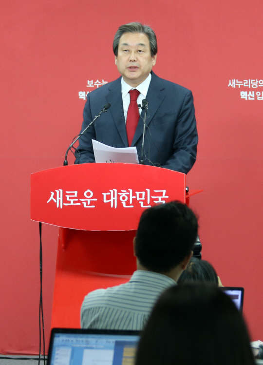 새누리당 김무성 대표가 24일 오후 서울 여의도 당사에서 긴급 기자회견을 열고 최고위에서 공천관리위의 의결이 보류된 유승민, 이재오 의원 지역구 등 5개 지역에 대해 의결을 하지 않고 중앙선관위 후보등록 만료일(25일)까지 최고위도 열지 않겠다고 밝히고 있다.