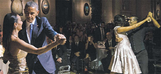 버락 오바마 미국 대통령과 부인 미셸 여사(오른쪽 두 번째)가 23일(현지시간) 아르헨티나 수도 부에노스아이레스의 키르치네르 문화센터에서 열린 국빈 만찬에서 댄서들과 탱고춤을 선보이고 있다.