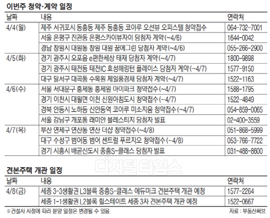 7일 대우건설은 대구 수성구 범어동에 짓는 범어 센트럴 푸르지오의 청약접수를 시작한다. 이 주상복합은 지하 5층∼지상 49층 5개 동, 전용면적 84㎡ 아파트 705가구와 전용 59∼75㎡ 오피스텔 112실로 구성된다. 지하철 2호선 범어역을 걸어서 이용할 수 있고 인근에 대구백화점, 범어시장, 신천시장, 수성구청, 경북대병원, 어린이대공원 등이 있다.8일 중흥토건은 세종시 3-3생활권 L3블록에 짓는 중흥S-클래스 에듀마크(890가구)의 견본주택을 개관할 예정이다. 이 아파트는 세종시에서 도시행정의 중심지인 3생활권에 위치해 있다.