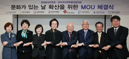 1일 서울 삼청로 국립현대미술관 서울관 국제화상회의실에서 이선재 광주여자대학교 총장(정성일 광주여자대학교 기획처장 대참·오른쪽부터), 이원복 덕성여자대학교 총장, 김낙훈 동덕여자대학교 총장, 표재순 문화융성위원회 위원장, 전혜정 서울여자대학교 총장, 심화진 성신여자대학교 총장, 황선혜 숙명여자대학교 총장, 최경희 이화여자대학교 총장이 '문화가 있는 날' 확산을 위한 업무협약을 체결하고 있다.