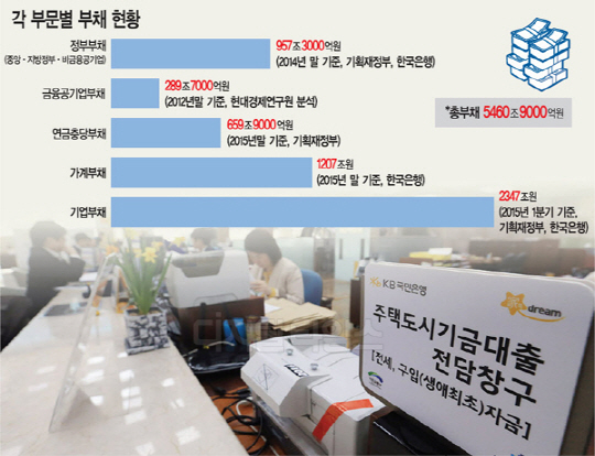 정부 공공분야 빚 1247조 연금충당분 포함땐 2000조 가계부채 1207조도 부담 기업부채도 2347조 넘어 지난해 GDP 3.2배 수준