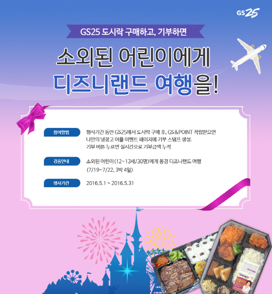 이 달 동안 GS25 도시락을 구매한 뒤, 'GS&POINT'를 적립하면 GS25의 모바일 앱 '나만의 냉장고' 기부 스탬프 1000원이 생성되며, 고객이 이 스탬프를 누르면 기부금이 적립된다. 회사는 소외 계층 어린이 30명을 3박 4일간 도쿄 디즈니랜드 여행을 보내는 데 모인 기부금을 쓸 예정이다.